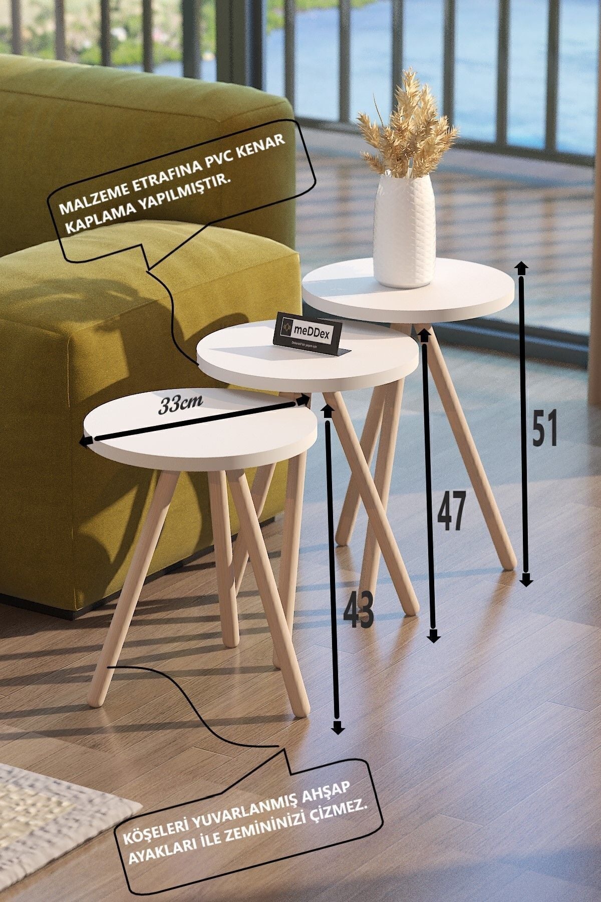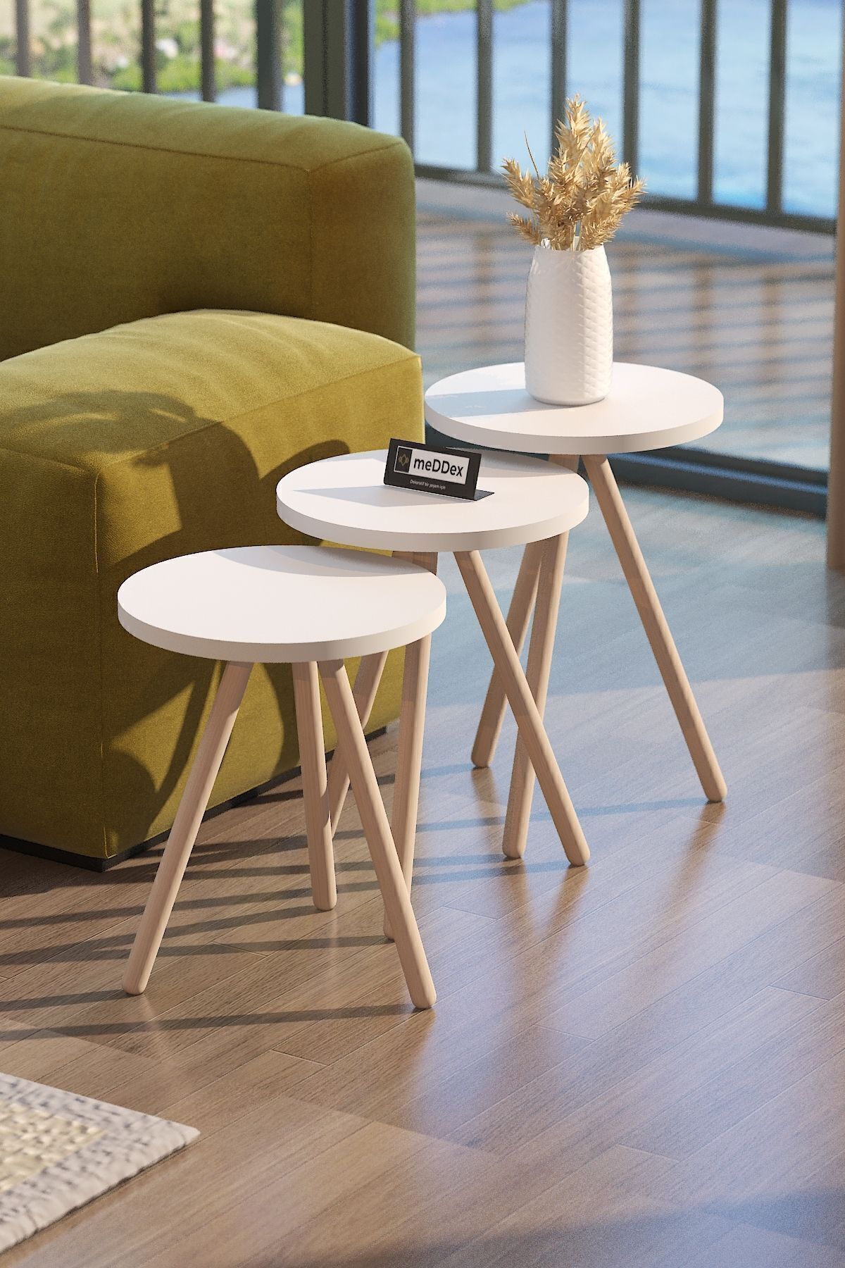 Linosa Üçlü Zigon Sehpa Ahşap Ayaklı Tasarım Beyaz Desen