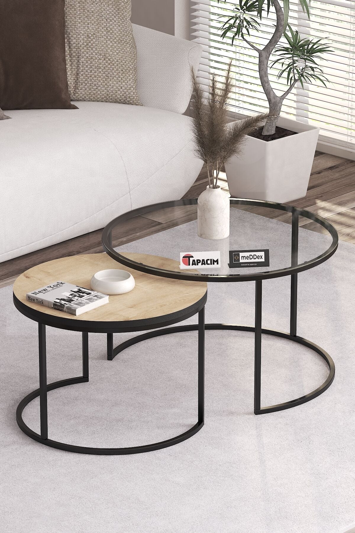 - Modern tasarımıyla dikkat çeken Rigo Orta Sehpa, metal malzemesi sayesinde dayanıklılığı ve şık görünümü bir arada sunar.; - Yuvarlak formu ile mekanınıza yumuşak bir dokunuş katar ve dekorasyonunuza estetik bir uyum sağlar.; - Safir Meşe Rengi Suntalam , her türlü iç mekan rengiyle kolayca uyum sağlayarak mekanınıza sofistike bir hava katar.; Büyük Sehpa : En:70cm Boy:70cm Yükseklik45cm Küçük Sehpa : En:55cm Boy:55cm Yükseklik40cm Ürünümüzün iskeleti 15*15mm metal profilden imal edilmiştir.; Ürüne ait metal iskelet çizilmeye ve paslanmaya karşı dirençli fırınlanmış elektro statik boya ile kaplanmıştır.; Ürünümüzün rafları çizilmeye dayanıklı, kırılmaz temperli camdan imal edilmiştir.; Ürünün temizliğini hafif nemli bez ile yapınız.; Ürün tarafınıza demonte olarak gönderilecek olup, montaj için gerekli aksesuarlar ve montaj şeması kutu içerisinde yer almaktadır.; Ürün montajını tornavida yardımıyla kolaylıkla yapabilirsiniz.